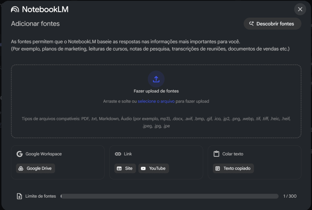 Ao acessar o notebooklm.google.com, você cria um novo projeto. A mágica acontece na seleção das fontes. Você pode fazer o upload de PDFs inteiros — como aquele “Guia do Iniciante” ou os livros digitais que seu Mentor disponibiliza [00:29].